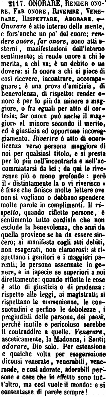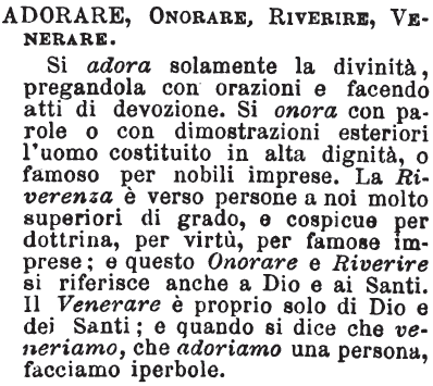 | Adorare, Onorare, Riverire, Venerare - Si adora solamente la divinità, pregandola con orazioni e facendo atti di devozione. Si onora con parole o con dimostrazioni esteriori l'uomo costituito in alta dignità, o famoso per nobili imprese. La Riverenza è verso persone a noi molto superiori di grado, e cospicue per dottrina, per virtù, per famose imprese; e questo Onorare e Riverire si riferisce anche a Dio e ai Santi. Il Venerare è proprio solo di Dio e dei Santi; e quando si dice che veneriamo, che adoriamo una persona, facciamo iperbole. [immagine] |