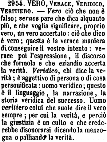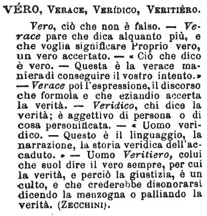 Vero, Verace, Veridico, Veritiero - Vero, ciò che non è falso. - Verace pare che dica alquanto più, e che voglia significare Proprio vero, un vero accertato. - «Ciò che dico è vero. -Questa è la verace maniera di conseguire il vostro intento.» - Verace poi l'espressione, il discorso che formola e che eziandio accerta la verità. - Veridico, chi dice la verità; è aggettivo di persona o di cosa personificata. - «Uomo veridico. - Questo è il linguaggio, la narrazione, la storia veridica dell'accaduto.» - Uomo Veritiero, colui che suol dire il vero sempre, per cui la verità, e perciò la giustizia, è un culto, e che crederebbe disonorarsi dicendo la menzogna o palliando la verità. (Zecchini). [immagine]