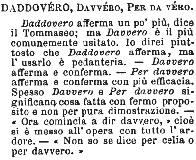 Daddovero, Davvero, Per da vero - Daddovero afferma un po' più, dice il Tommaseo; ma Davvero è il più comunemente usitato. Io direi piuttosto che Daddovero afferma, ma l'usarlo è pedanteria. - Davvero afferma e conferma. - Per davvero afferma e conferma con più efficacia. Spesso Davvero e Per davvero significano cosa fatta con fermo proposito e non per pura dimostrazione. - «Ora comincia a dir davvero,» cioè si è messo all'opera con tutto l'ardore. - «Non so se dice per celia o per davvero.» [immagine]