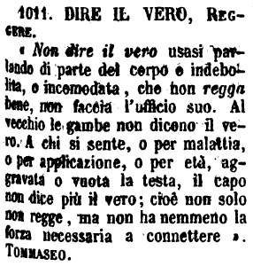 Dire il vero, Reggere - «Non dire il vero usasi parlando di parte del corpo o indebolita, o incomodata, che non regga bene, non faccia l'ufficio suo. Al vecchio le gambe non dicono il vero. A chi si sente, o per malattia, o per applicazione, o per età, aggravata o vuota la testa, il capo non dice più il vero; cioè non solo non regge, ma non ha nemmeno la forza necessaria a connettere». Tommaseo. [immagine]
