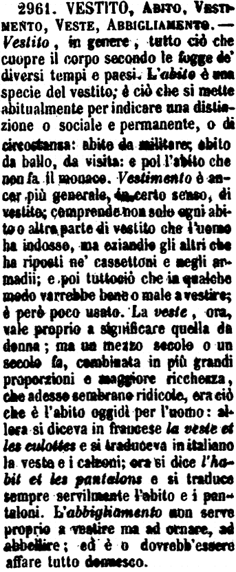 | Vestito, Abito, Vestimento, Veste, Abbigliamento - Vestito, in genere, tutto ciò che cuopre il corpo secondo le fogge de' diversi tempi e paesi. L'abito è una specie del vestito; è ciò che si mette abitualmente per indicare una distinzione o sociale e permanente, o di circostanza: abito da militare; abito da ballo, da visita: e poi l'abito che non fa il monaco. Vestimento è ancor più generale, in certo senso, di vestito; comprende non solo ogni abito o altra parte di vestito che l'uomo ha indosso, ma eziandio gli altri che ha riposti ne' cassettoni e negli armadii; e poi tuttociò che in qualche modo varrebbe bene o male a vestire; è però poco usato. La veste, ora, vale proprio a significare quella da donna; ma un mezzo secolo o un secolo fa, combinata in più grandi proporzioni e maggiore ricchezza, che adesso sembrano ridicole, era ciò che è l'abito oggidì per l'uomo: allora si diceva in francese la veste et les culottes e si traduceva in italiano la veste e i calzoni; ora si dice l'habit et les pantalons e si traduce sempre servilmente l'abito e i pantaloni. L'abbigliamento non serve proprio a vestire ma ad ornare, ad abbellire; ed è o dovrebb'essere affare tutto donnesco. [immagine] |