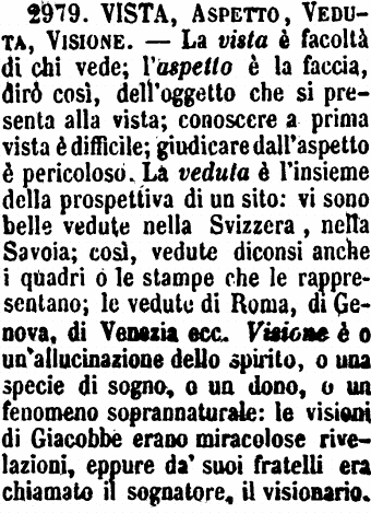 | Aspetto, Vista, Veduta - Queste voci sono objettive e subjettive. - L'Aspetto è la forma sotto la quale si porge ai nostri occhi la persona e la cosa. - «Uomo di bell'aspetto; all'aspetto par lui.» - Aspetto è parimente il modo come altri vede - «Al mio aspetto è una bella creatura.» - Vista è La facoltà visiva, ed è parimente L'insieme degli oggetti che si offrono alla vista. - La Veduta è raramente subjettiva, e in questo caso è l'atto, non la facoltà del vedere. Più raramente si piglia per i luoghi che per vasto tratto si presentano allo sguardo. - «Nella mia villa c'è una veduta maravigliosa.» [immagine] |