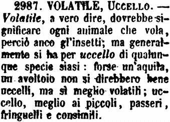 | Volatile, Uccello - Volatile, a vero dire, dovrebbe significare ogni animale che vola, perciò anco gl'insetti; ma generalmente si ha per uccello di qualunque specie siasi: forse un'aquila, un avoltoio non si direbbero bene uccelli, ma sì meglio volatili; uccello, meglio ai piccoli, passeri, fringuelli e consimili. [immagine] |