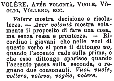 | Volere, Aver volontà, Vuole, Voglio, Vollero, ecc. - Volere mostra decisione e risolutezza. - Aver volontà mostra solamente il proposito di fare una cosa, ma senza ressa e prontezza. - Ricordino i giovani che nelle voci di questo verbo si pone il dittongo uo, quando l'accento cade sulla prima, e che esso dittongo sparisce quando l'accento passa sulla seconda, o regnano due consonanti. Vuoi, vuole, vollero, voleva, voglio, volere. [immagine] |