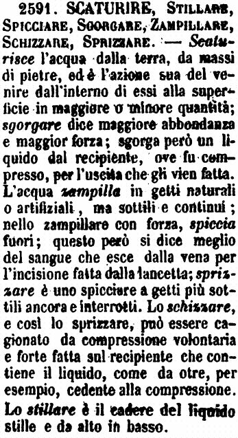 | Zampillare, Spicciare - Lo Zampillare è proprio di liquidi che si lanciano in alto con impeto da un foro piuttosto stretto. Spicciare è uscir fuori con minore impeto e perpendicolarmente e orizzontalmente, non verticalmente. Zampillare include l'idea del dividersi come in lunghi spruzzi; lo Spicciare dell'uscire a modo di bolle o di gallozzole come acqua di polla. - Lo Zampillare è continuo; lo Spicciare può essere anche interrotto. G. F. [immagine] |