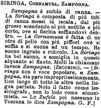 | Siringa, Cornamusa, Zampogna - Zampogna è zufolo di canna. - La Siringa è composta di più tubi di canna messi in iscala, dal più grosso scendendo al più sottile e più corto, ove si fischia soffiandovi dentro. - La Cornamusa è fatta di un otre di pelle con più pifferi ove si soffia e si suona ad un tempo. Ha suono ingrato e ridicolo. La Siringa ha bel suono, e somiglia in questo alquanto al flauto. Molti la chiamano invece Zampogna. (Zecchini). - [Siringa non è voce popolare, e Zampogna, sia pure impropriissimamente, tien luogo di tutte le altre nella lingua parlata. Noto il fatto come lessicografo, non lo lodo come sinonimista. - Lo Zufolo poi nessuno in Toscana lo dice Zampogna. G. F.] [immagine] |