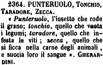 | Punteruolo, Tonchio, Taradore, Zecca - « Punteruolo, l'insetto che rode il grano; tonchio, quello che vuota i legumi; taradore, quello che infesta le viti; zecca, quello che si ficca nella carne degli animali, e succia loro il sangue ». Gherardini. [immagine] |